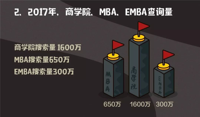 创新创业在当下依然面临着多重困难和严峻挑战。技能、经验、资源、人脉成为众多创业者不得不去翻越的大山。报告显示,2017年“商学院”搜索量1600万,“MBA”搜索量650万, “EMBA”搜索量300万。毕竟那里传递的不仅是知识,还是获得人脉、融资的良好渠道。