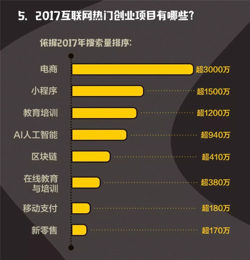 狂热、蜂拥……在一波又一波互联网创业浪潮里,每年都会有热门领域,每次的热门领域里又都拥挤着众多创业者。尤其是进入互联网时代后,每一次风口都能在一定程度上对创业者选择创业项目造成影响。从《报告》可以看出,电商、小程序、教育培新、AI人工智能是2017年的最热门创业项目,并且将会继续大面积影响人们生活的一种创业存在。